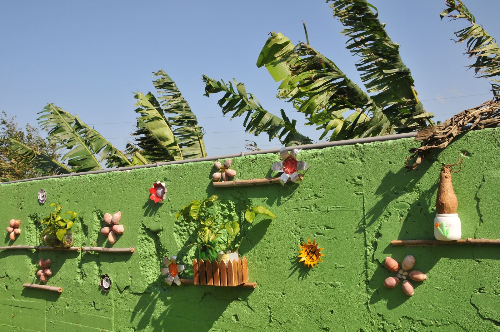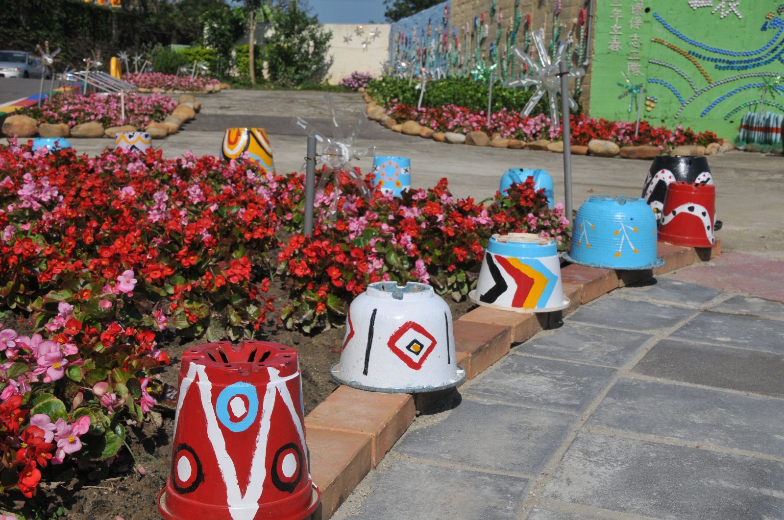 (記者馮國寶大園報導)大園區南港里獲選參加桃園市政府環保局「低碳環保鄰里計畫」南港里聯大社區旁的環保公園,眾多創意擺設。用瓶蓋創作而成的環保藝術彩繪牆前,萬紫千紅的園圃,四周設有環保風車,是用寶特瓶、舊衣架與廢水管剪裁而成。