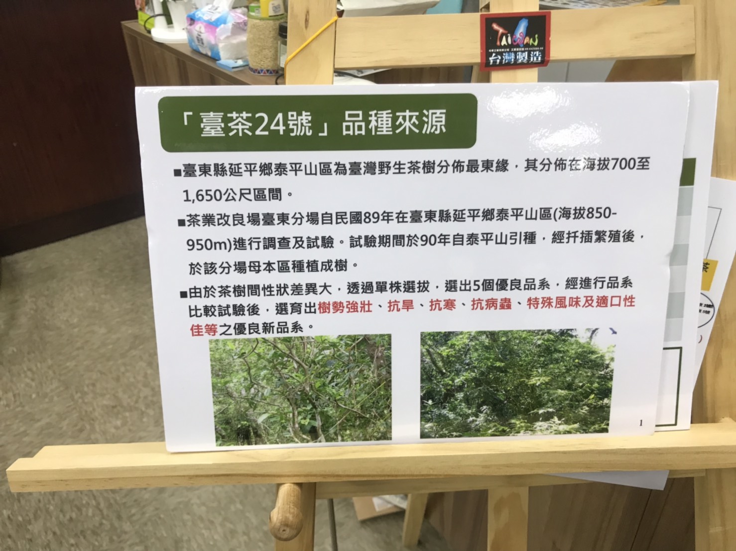 臺茶24號原生茶樹屬於冰河時期遺留下的植物,具有菇蕈、杏仁及咖啡的獨特香氣,出自臺東縣泰平山區,今(108) 年六月正式通過命名,品系代號為「臺東永康1號」,是目前臺茶系列品種中,唯一純臺灣原生山茶的茶樹品種。