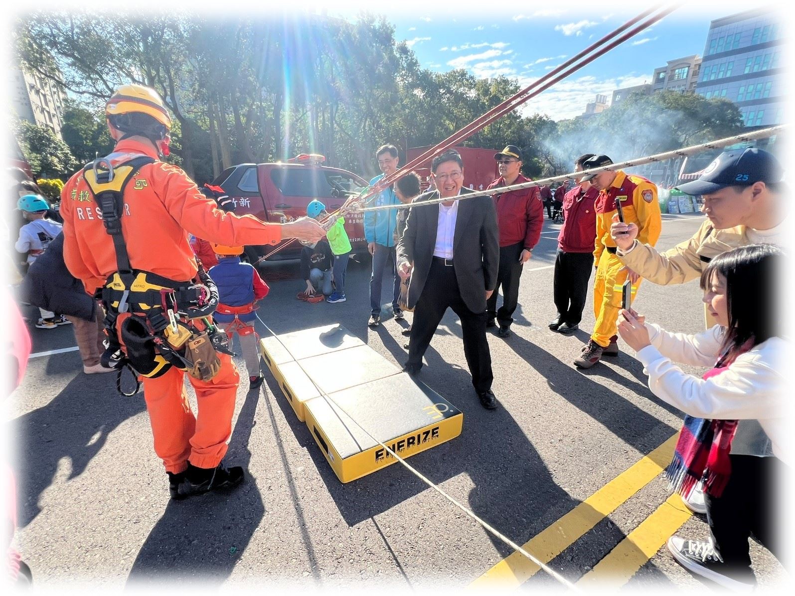 局長陳中振表示,活動由消防局精心規劃,傳統防災宣導轉化為互動式體驗,現場設置多項防災闖關與實作攤位,包括 CPR+AED 急救教學、一氧化碳防範宣導、水域安全守護與射水體驗、地震體驗車、防火宣導車及消防知識闖關遊戲,讓大小朋友在參與過程中,親手操作、實際學習,深化防災觀念。